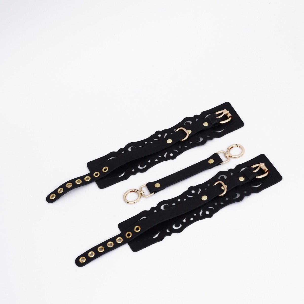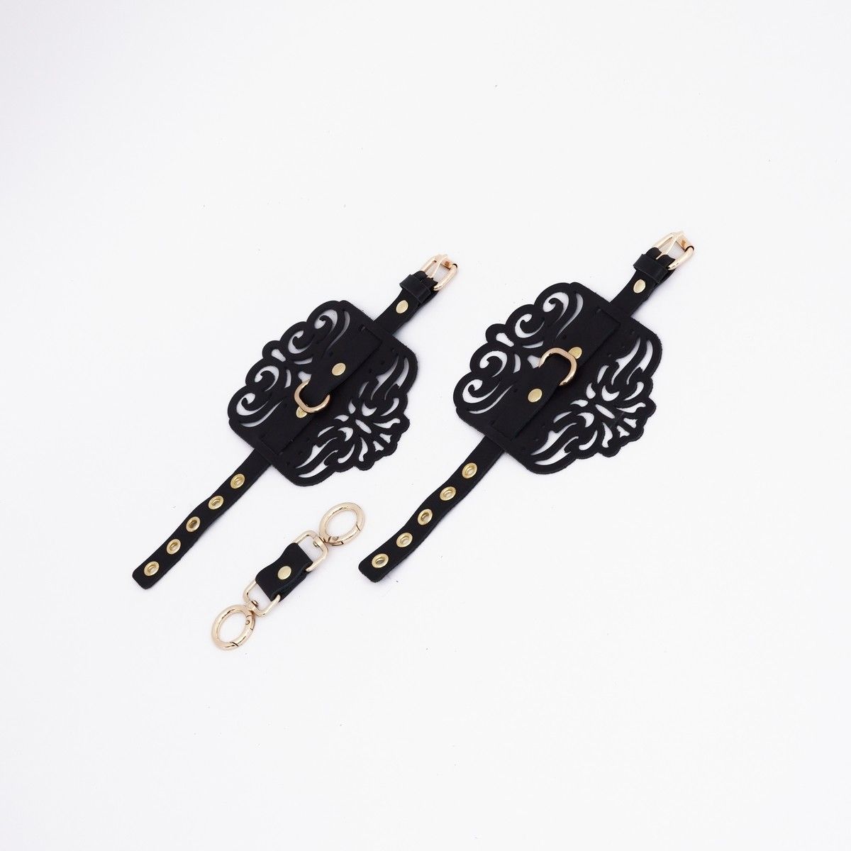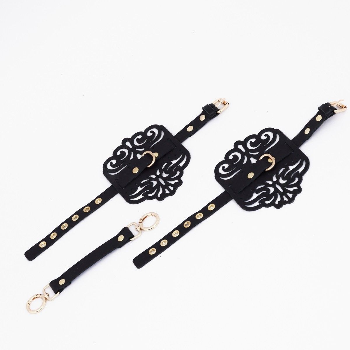 Черный кожаные оковы с узорами и золотистой фурнитурой