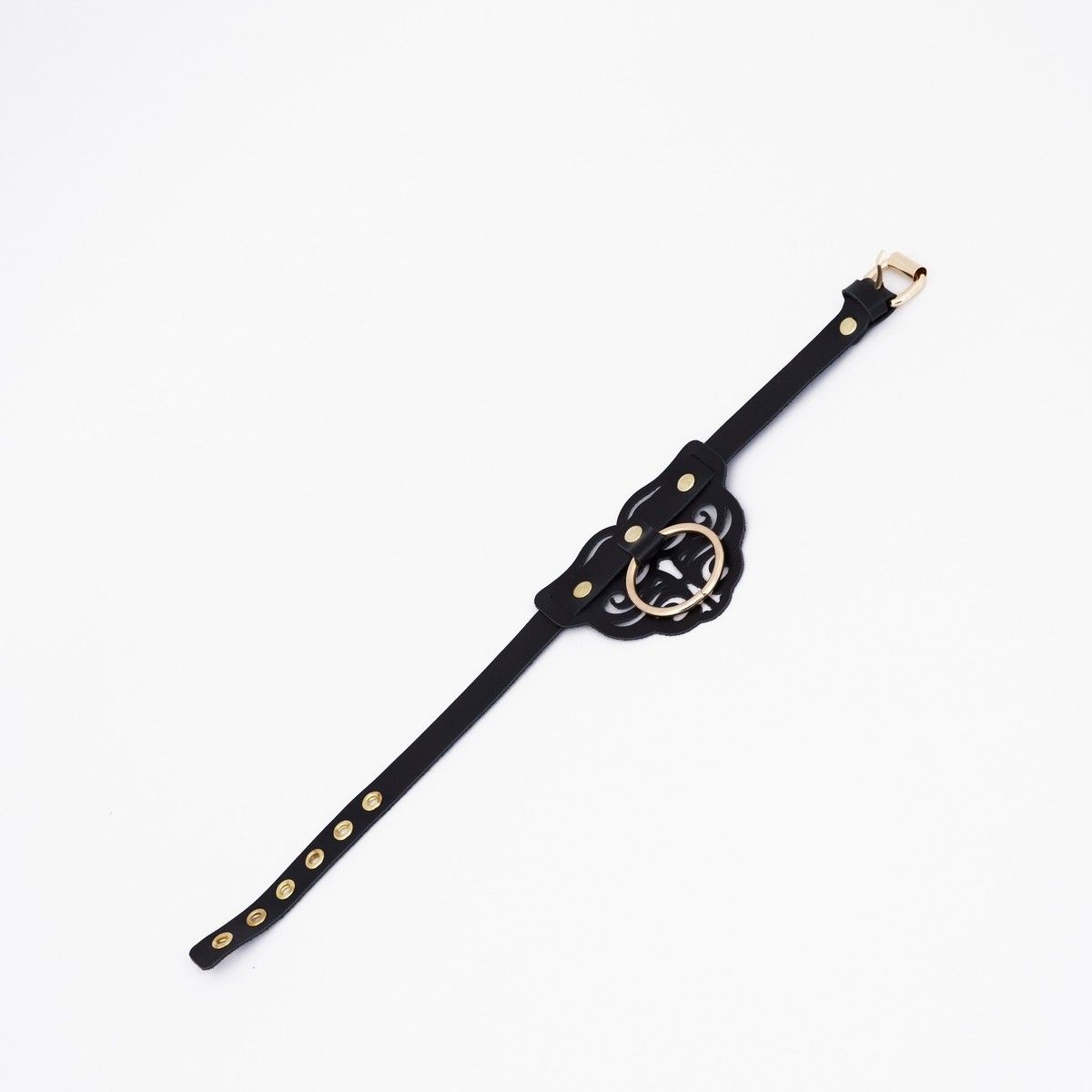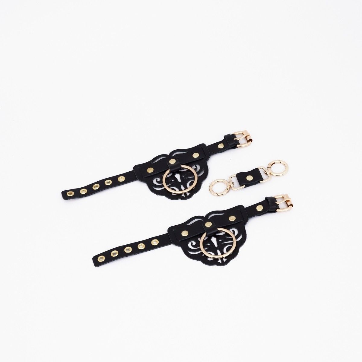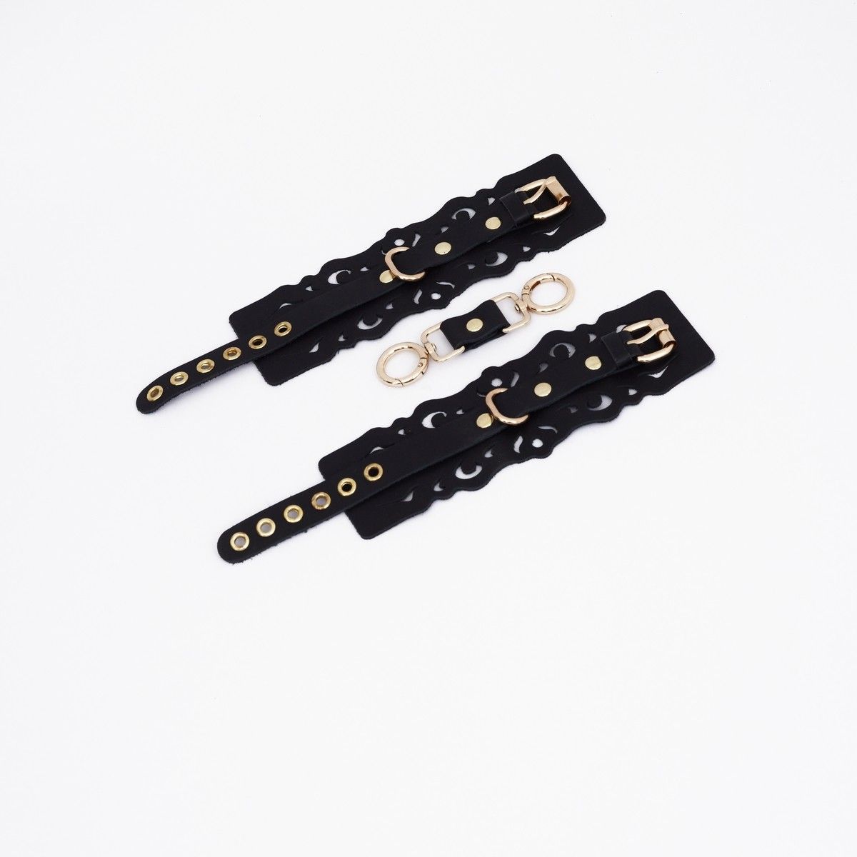 Черный кожаные оковы с узорами и золотистой фурнитурой