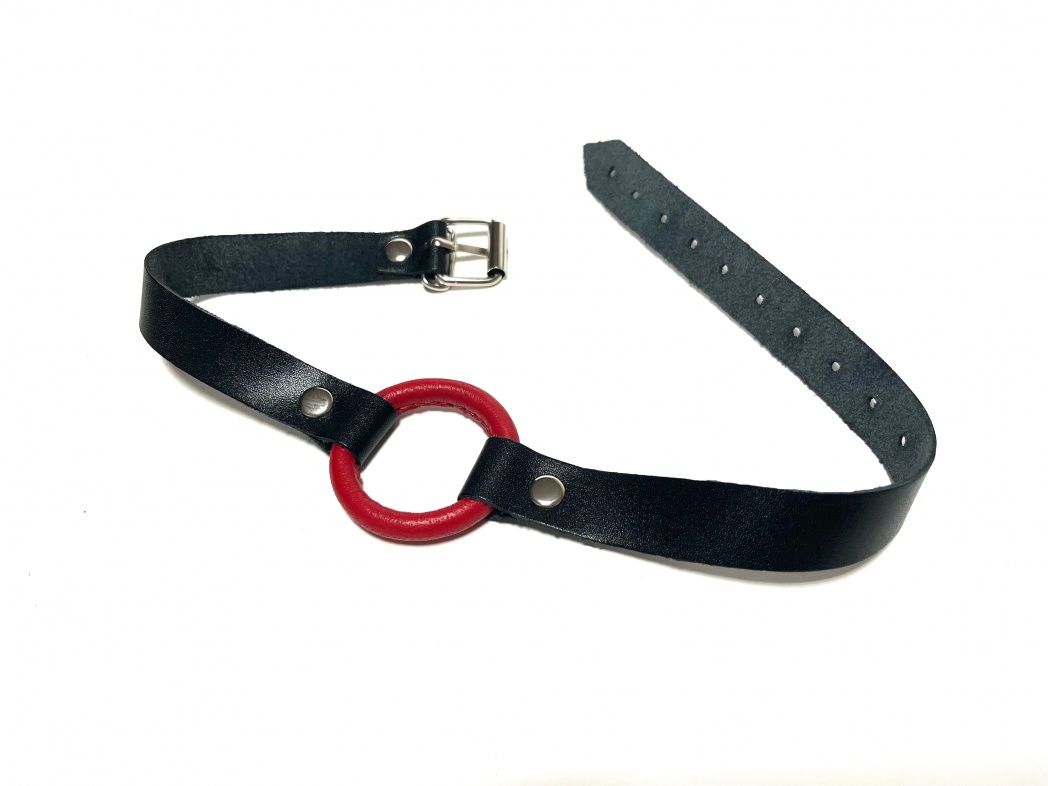 Красный кляп-кольцо на черных кожаных ремешках