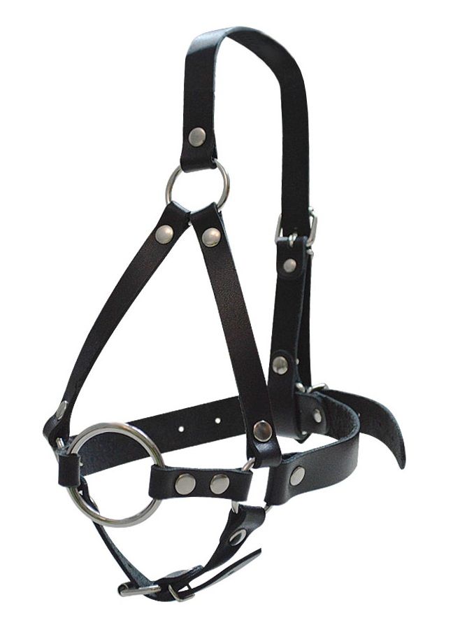 Кляп-рамка со сбруей на голову из черных кожаных ремешков. ..