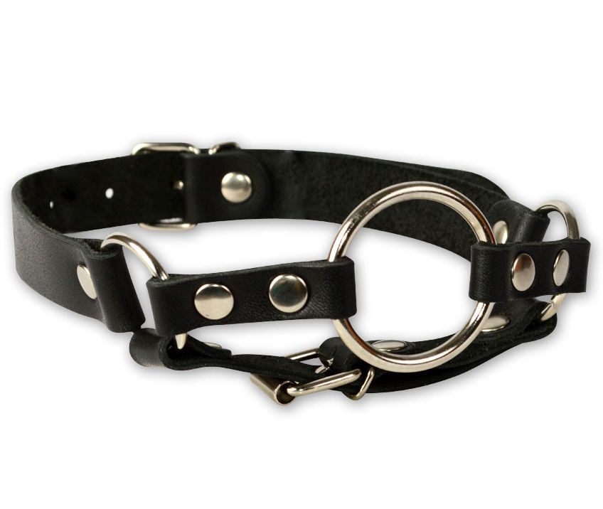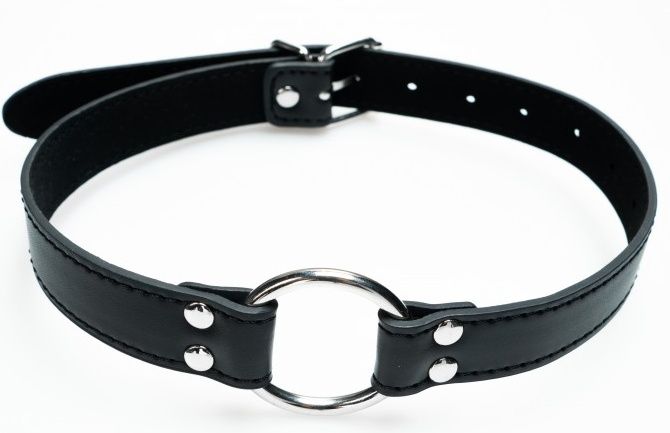 Кляп-кольцо на чёрных кожаных ремешках с застёжкой. Внешний диаметр кольца 44 мм. ..