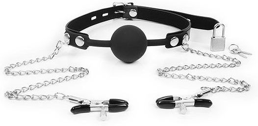 Черный кляп-шарик с зажимами на соски на металлической цепочке