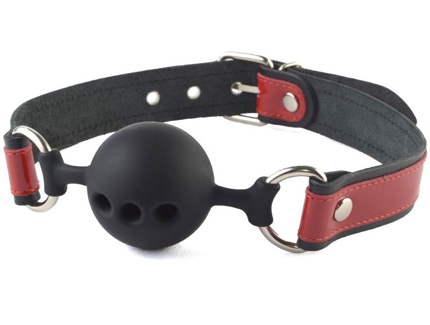 Кляп с оригинальным кожаным ремешком и лаковыми вставками красного цвета. Сам кляп-шар изготовлен из..