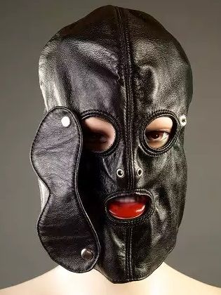 Маска выполнена из натуральной гладкой черной кожи. Фиксация производится металлической пряжкой сзад..