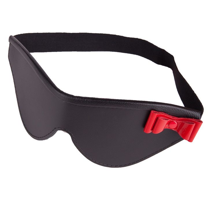 Маска на глаза закрытого типа из натуральной кожи черного цвета, украшенная красным лаковым бантом. ..