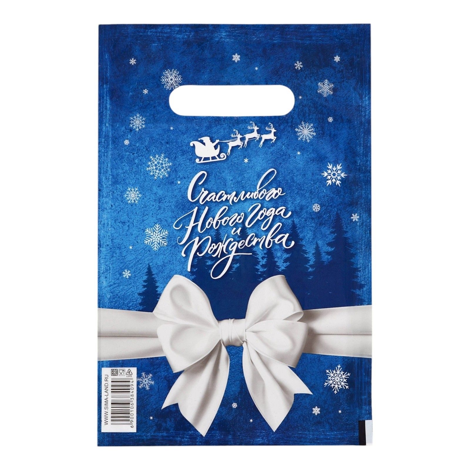 Сине-белый подарочный новогодний пакет с вырубной ручкой (20х30 см)
