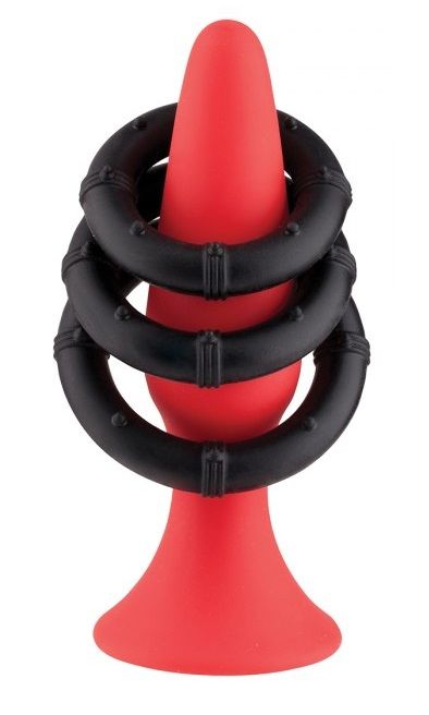 Красный плаг для анальной стимуляции из силикона. В наборе 3 черных силиконовых кольца, которые мож..