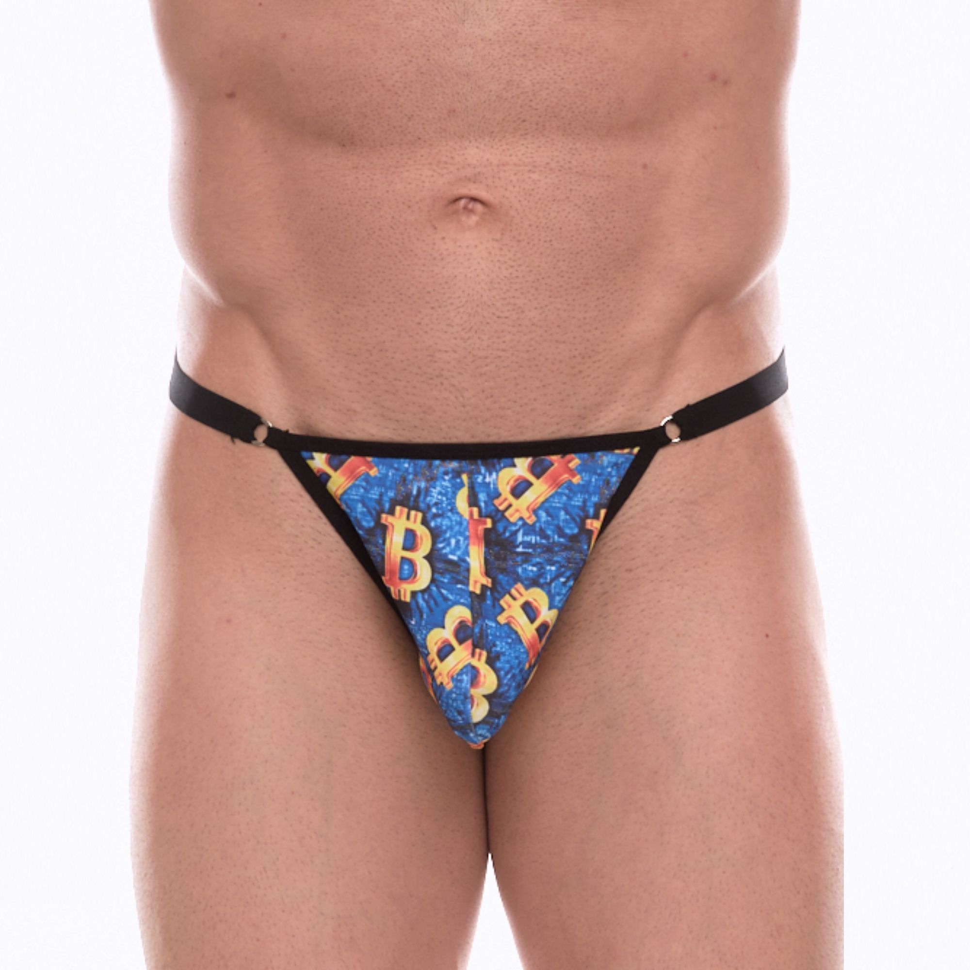 Синие мужские трусы-тонги с разноцветным принтом. ..